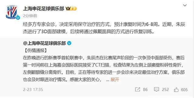 2 月 26 号北京时间的时候,上海申花通过他们的官方社交平台,把后防大将朱辰杰的预计康复时间给公布出来啦。经过好多专家一起会诊后,朱辰杰大概得 6 到 8 周的时间才能完全好起来。这就表明,朱辰杰肯定没办法参加 3 月份国足的那 2 场世预赛啦。3 月 21 号要在客场跟沙特队比赛,3 月 25 号还要在主场跟澳大利亚队比赛呢。
